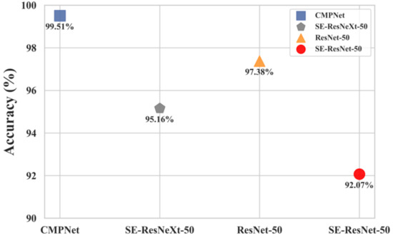 The corresponding wheat image test dataset was input into the sub-model, and the classification results were statistically analyzed to obtain the average accuracy rate of the wheat classification and recognition of each sub-model, as shown in Figure 13. The average accuracy of each model was above 92%, indicating that the deep learning model performed excellently in the classification and recognition of wheat varieties. At the same time, CMPNet achieved an average accuracy of 99.51% on the test dataset, which was 4.35%, 2.13%, and 7.44% higher than that of the SE-ResNeXt-50, ResNet-50, and SE-ResNet-50 models, respectively. The test dataset of SE-ResNeXt-50 was a picture of wheat at the tillering period, the test dataset of ResNet-50 was a picture of a wheat at the flowering period, and the test dataset of SE-ResNet-50 was a picture of wheat seeds.