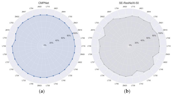 Each model was tested on the wheat image test dataset, and the accuracy rate of the 30 wheat varieties was obtained. Figure 14 shows the test results of each model on the 30 wheat varieties; there are 30 wheat varieties on the circle, and the length of the radius is the precision. The accuracy of the model for each wheat variety is expressed in the form of polar coordinates. Each point on the polar coordinates is connected to the drawn convex hull in turn. The closer it was to a circle with a radius of 100%, the stronger the overall recognition ability of the model. The accuracy of the model on each wheat variety was used to draw the convex hull. When the drawn convex hull was closer to a circle with a radius of 100%, the model had a better overall recognition accuracy for each wheat variety. It can be seen from the figure that CMPNet had a stronger generalization ability than the other models, and the recognition accuracy was also greatly improved. In addition to the relatively poor recognition ability of Lantian43, the recognition ability for the other varieties was also greatly improved, such as for Lantian35, Zhoumai21, etc.; some varieties, such as Jimai47, performed well in the recognition process of each model. To summarize, the results showed that the CMPNet model mainly corrected the errors of each sub-model in the classification and recognition processes.
