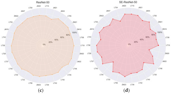 Comparison of the identification accuracies of the different varieties in each model. (a) CMPNet: the input data is wheat tillering period, flowering period, and seed image data; (b) SE-ResNeXt-50: the input data is wheat tillering period image data; (c) ResNet-50: the input data is wheat flowering period image data; and (d) SE-ResNet-50: the input data is seed image data.