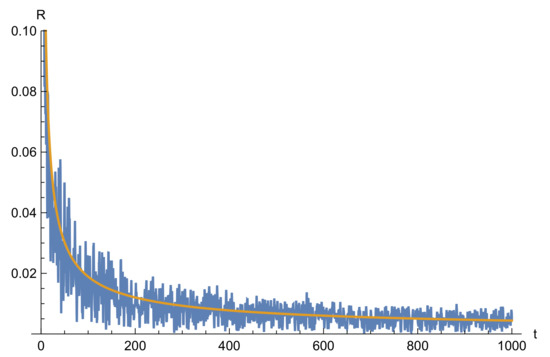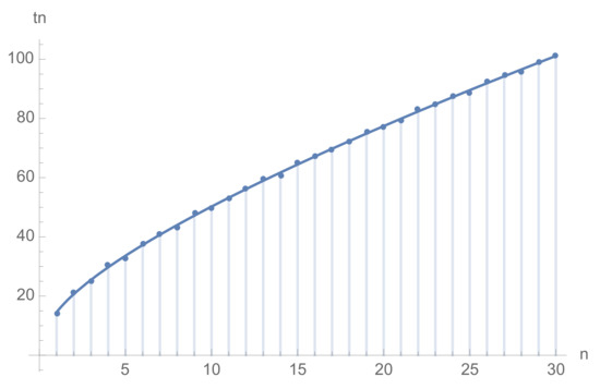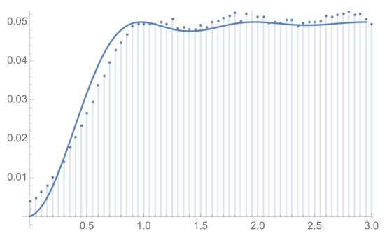 The fluctuations in the zeros come from since is a smooth function of n. These small fluctuations are shown in Figure 2. Let us define . One needs to properly normalize , taking into account that the spacing between zeros decreases as . To this end we expand the Equation (26) around . Using , one obtains where is the derivative with respect to t. Using , this leads us to define