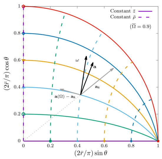 with . The surfaces of constant and are shown in Figure 1 using solid and dashed lines, respectively. The acceleration and vorticity vectors and , shown with black arrows, are discussed below.