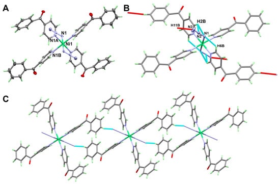 The structure of 1 comprised two intramolecular C-H...N interactions with donor-acceptor distances of 3.254(2) and 3.123(2) Å for the C22-H22…N2 and C26-H26…N1 interactions, respectively (Table 3). In addition, the neutral complex units are connected with each other via weak C-H…O interactions with a donor-acceptor distance of 3.419(2) Å. Presentation of the inter- and intra-molecular contacts, as well as the molecular packing, is shown in Figure 1B,C, respectively.