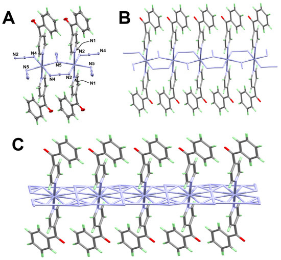 The structure of complex 1 comprised four 4bzpy molecules coordinating the Fe(II) central metal ion via the pyridine nitrogen atom. The coordination sphere of the Fe(II) is completed by two terminally coordinated trans-azide ions (Figure 1A). The [Fe(4bzpy)4(N3)2] complex possesses an inversion center located at the Fe atom, hence the asymmetric unit comprised half [Fe(4bzpy)4(N3)2] molecule. The most important geometrical parameters including bond distances and angles are listed in Table 2. The Fe-N(pyridine) distances (Fe1-N11: 2.2604(11) Å and Fe1-N21: 2.2929(11) Å) are shorter than the Fe-N(azide) (Fe1-N1: 2.1080(12) Å). All trans-N-Fe-N angles have exactly the ideal values for the perfect octahedron while the cis-N-Fe-N bond angles are close to 90° (87.96(4)–2.03(4)°). Hence, the coordination environment around Fe(II) could be described as a slightly distorted octahedron.