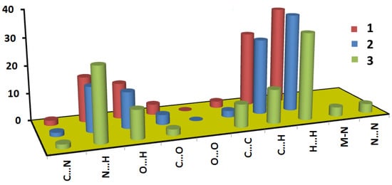 The different Hirshfeld surfaces [39,40,41,42] are shown in Figure S1 (Data) while the intermolecular contacts and their percentages are shown in Figure 4. In the case of complex 3, the Hirshfeld calculations were performed for one of the disordered parts of this complex as the results of the two parts are almost the same. The polar O…H and N…H hydrogen bonding interactions as well as the hydrophobic C…H contacts are the most common interactions in the crystal structure of the studied systems. The O…H contact percentages are 12.8, 13.1 and 10.5% for 1, 2, and 3, respectively. The shortest O...H contacts are O27...H112 (2.491 Å), O7B...H12A (2.499 Å), and O1...H8 (2.571 Å), respectively. The N…H contacts contributed by 16.3, 16.2, and 26.5%, for 1, 2, and 3, respectively, and the N3...H211 (2.507 Å), N3...H11B (2.453 Å), and N2...H5 (2.488 Å) are the shortest N...H contacts, respectively. On the other hand, the nonpolar C…H contact percentages are 27.1, 27.4, and 10.5%, respectively. The shortest C...H distances that belong to the C-H...π interactions are C23...H10 (2.678 Å), C3B...H10A (2.650 Å), and C4...H12 (2.680 Å), respectively.