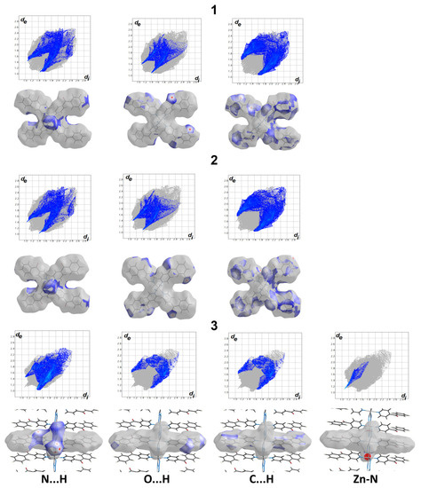 The decomposed dnorm and FP plots of the N…H, O...H, and C…H contacts in the studied complexes as well as the bridging Zn–N coordination interactions in 3.