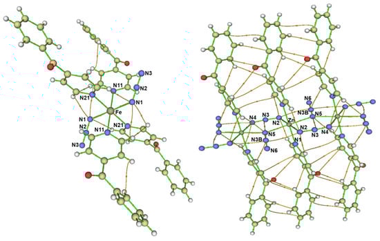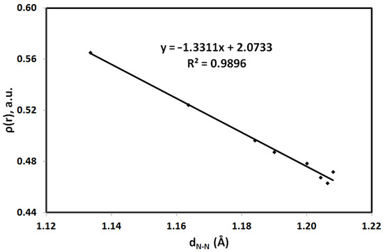 Topological parameters of the atoms in molecules (AIM) [37] theory have great importance in describing the nature and strength of atom–atom interactions [44,45,46,47,48,49]. In this study, we employed these parameters to describe the degree of asymmetry of the azido group in the three complexes presented in this work. The electron density (ρ(r)) at the (3, −1) bond critical point (BCP; Figure 7) is a good measure for the bond strength. The N-N distances (dN-N) and the corresponding topological parameters at the N-N BCPs in the studied complexes are summarized in Table 6. It is clear that in all complexes, the two N-N bonds of an azido group are not identical. The degree of asymmetry is the highest in the case of the terminal azide in the Fe(II) and Ni(II) complexes. This could be simply confirmed by calculating the difference (Δd) between the two N-N bond distances in these azido groups which are also listed in the same table. The most symmetric situation occurred in the azide groups of the Zn(II) complex where the two azido groups coordinating the Zn(II) ion either in a μ(1,3) or μ(1,1) mode of bonding. Interestingly, the electron density (ρ(r)) topological parameter correlated well with the N-N distances of the azido groups (Figure 8). There is a clear dramatic decrease in the ρ(r) values with increasing N-N distances which could be used as a measure for the degree of asymmetry of the coordinated azido group. In addition, the high ρ(r) and negative ∇2ρ(r) at the N-N BCPs indicate clear covalent interactions.