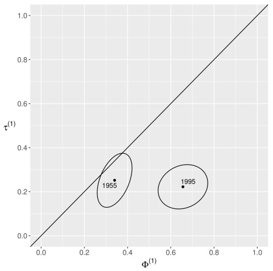 respectively. Figure 1 shows point estimates and approximate confidence regions of the two-dimensional index for the real data in [18,19]. The vertical and horizontal axes in Figure 1 represent the values of indexes and , respectively. Since these confidence regions do not overlap, it is inferred that these data have different probability structures. From Table 1 and Figure 1, we can see that the degree of departure from the symmetry model for the data in [19] is lager than for the data in [18]. Additionally, the confidence region of for the data in [18] includes the line passing through the points and , but the confidence region of for the data in [19] does not. Therefore, the probability structure of the data in [18] may have conditional difference asymmetry, and we can see that the father’s occupational status in Japan in 1955 has a greater influence on his son’s status than in 1995.
