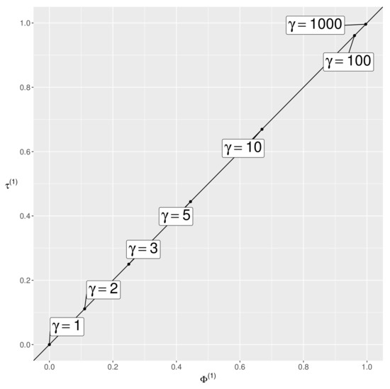 Note that is [17]’s diversity index of degree including the Shannon entropy (), and the real number is chosen by the user. The index has the following characteristics: (i) ; (ii) if, and only if, the symmetry model holds; and (iii) if, and only if, the degree of asymmetry is maximum in the sense that (then ) or (then ) for all .