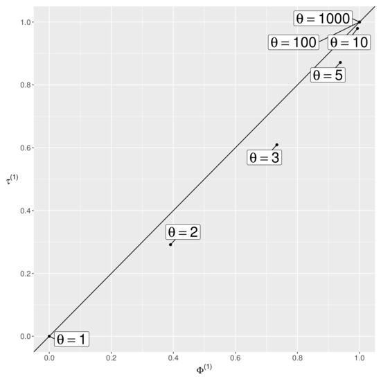 Figure 2 plots the values of the proposed index for in the conditional symmetry model. The vertical and horizontal axes in Figure 2 represent the values of indexes and , respectively. From Figure 2, as the value of increases, the value of approaches and lies on the straight line passing through and . On the other hand, Figure 3 plots the values of the proposed index for in the linear diagonals-parameter model. The vertical and horizontal axes in Figure 3 represent the values of indexes and , respectively. As can be seen in Figure 3, the value of approaches as the value of increases, but the value of does not lie on the straight line passing through and for all values of . Similar results are observed for another value of , although the details are omitted. This difference is due to the fact that the proposed index measures the degree of departure from symmetry in terms of the log odds of each symmetric cell with respect to the main diagonal in the table.
