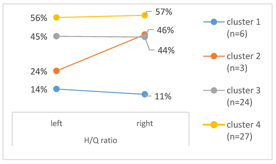 Due to the lack of significant relationships between the above-mentioned groups of parameters, the tested group was characterized using cluster analysis. Agglomeration was performed using Ward’s method and urban distance (Manhattan). Four clusters were distinguished based on H/Q ratios for the left and right limbs. In the distinguished clusters, basic descriptive techniques were applied and one-way analysis of variance (ANOVA) was performed. For all tests, the probability level limits were set at p = 0.05.