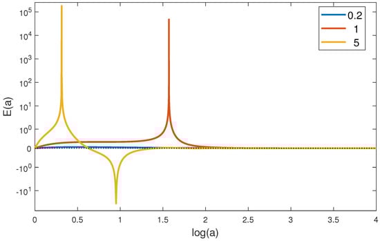 When , the numerical analysis of the key Equations (46) and (47) shows that all the curves are located below the horizontal line . This means that the electric field E, Hubble function H and scale factors a, c take finite values, i.e., the catastrophic regime cannot be realized. We illustrate this fact using Figure 1, Figure 2 and Figure 3.
