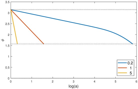 Illustrations of the behavior of the axion field with initial value . The graphs are monotonic, and the axion field reaches the value for the finite value of the reduced scale factor x. The corresponding values of the electric field are infinite. The geometric characteristics of the Universe reveal singularity.
