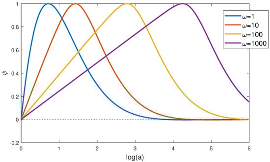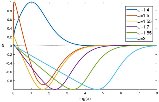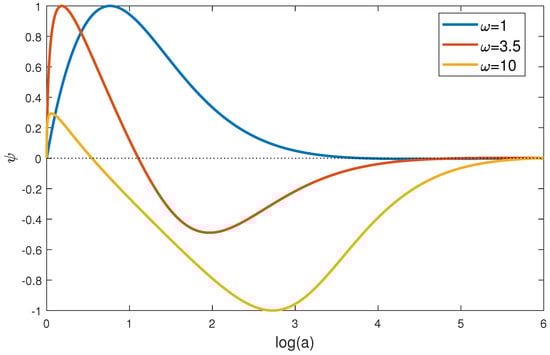Clearly, the sign of the second derivative depends on the sign of the function : when , we see that , and we observe the maxima; when , we deal with the minima. If , the corresponding second derivative becomes large due to the term proportional to , this means that the degree of convexity/concavity of the graph increases, but the typical structure of the extrema is preserved. The damping of these oscillations is provided by the multipliers of the type and , which decrease when the reduced scale factor grows.
