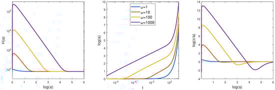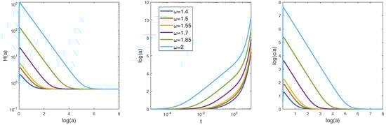 Illustrations of the geometric properties of the model. The behavior of the reduced Hubble function is presented on the left panel; the central panel contains the graph of the scale factor ; and the right panel presents the evolution of the ratio . Oscillations of the axion field declare themselves in the form of ripples on the graph of the Hubble function. Asymptotically, tends toward the de Sitter constant , and the ratio tends toward one, thus confirming the fact of the Universe isotropization.