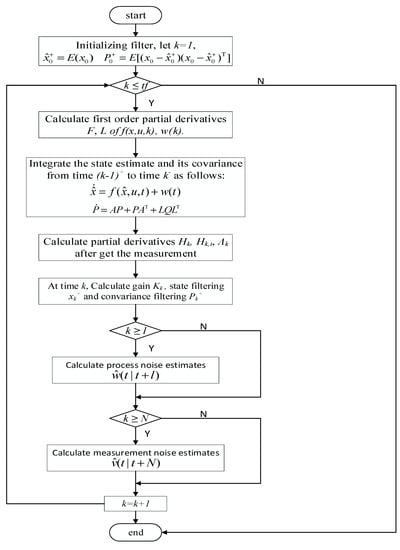 According to the theoretical derivation of Theorem 1 and Theorem 2, we can use a flowchart to represent the white noise estimation algorithm in the following Figure 1, where  represent time, smoothing step of process noise, smoothing step of measurement noise, and end time, respectively.