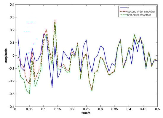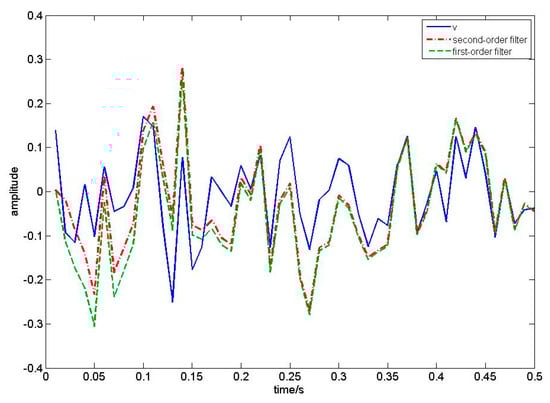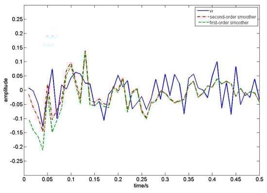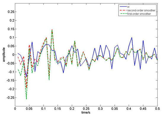 In this numerical simulation, we compare our algorithm with first-order EKF white noise estimators by setting that ,  and the sampling period is 0.01s. We take 50 sampling periods to draw Figure 2, Figure 3, Figure 4 and Figure 5. According to Theorem 1, the filtering algorithm cannot achieve the process noise estimate. Therefore, in Figure 2, we use one-step smoothing algorithm to estimate the process noise. Figure 2 shows the true value of process white noise and its one-step smoothing of two methods. Figure 3 shows the true value of process white noise  and its three-step smoothing of two methods. Figure 4 shows the true value of measurement white noise  and its filtering of two methods. Figure 5 shows the true value of measurement white noise  and its three-step smoothing of two methods. From Figure 2 to Figure 5, it is shown that the white noise estimators based on the first-order EKF fluctuates greatly, while the estimator based on second-order EKF have higher estimation accuracy. In other words, the second-order EKF white noise estimators are better than the first-order EKF white noise estimators. Moreover, it can be seen that the process noise estimation is affected by the discrete observation equation, and loses some information. Therefore, the estimation effect is not as good as the measurement noise estimation. The measurement noise estimation will gradually approach the real curve with the update of time. Moreover, we take 50 sampling periods to calculate the error loss value of two different methods. Taking the mean square error (MSE) as the evaluation index, the loss value is shown in Table 1.