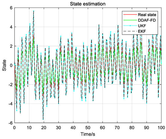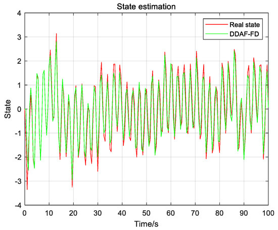where, and respectively represent the actual state and estimated state of the system. The mean absolute error pairs of DDAF-FD, UKF and EKF methods are shown in Table 1.