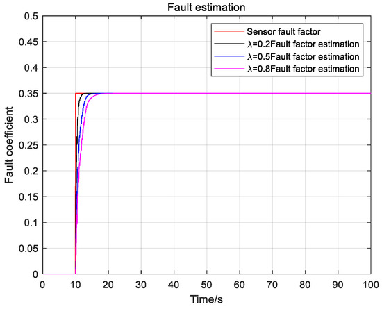 Figure 5 and Figure 6 show that the parameter estimation performance of the DDAF-FD algorithm depends on the forgetting factor . The DDAF-FD algorithm can estimate steady faults, and it can be clearly observed that when the system fails, the proposed DDAF-FD algorithm can effectively track the fault factor. As the forgetting factor decreases, the estimated convergence speed increases. Thus, the smaller the forgetting factor, the greater the sensitivity of the algorithm to system faults.