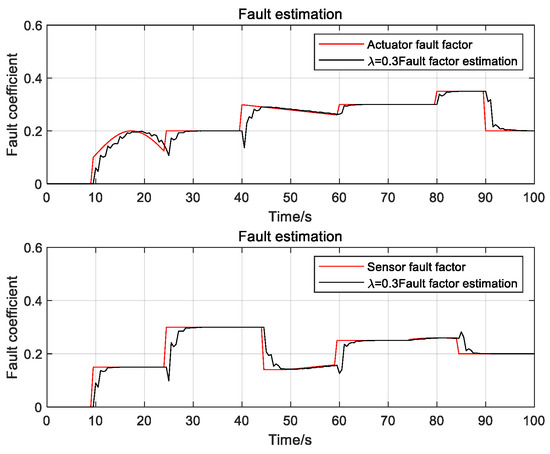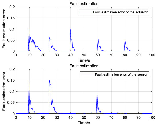 When simultaneous actuator and sensor faults occur, the system input deviates from the expected value, and the measured value also deviates from the expected value. represents the actuator fault, and represents the sensor fault, where , , represents the actuator fault factor, and represents the sensor fault factor. When the actuator and sensor include faults (such as gain loss), the fault factors vary from 0 to 1. Here, is the output value of the system with measurement noise, where , . Let , , .