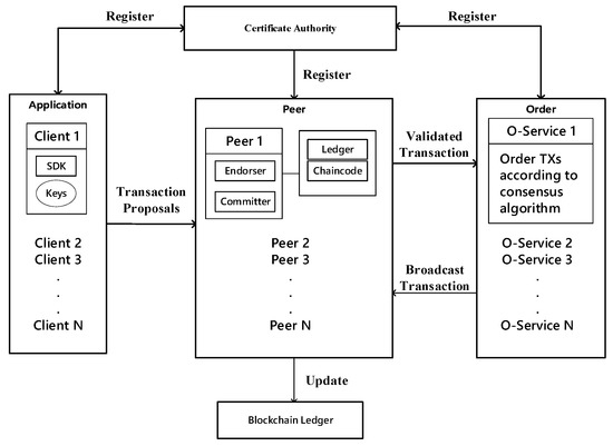 Hyperledger Fabric (Hyperledger Architecture) is an open-source project launched by the Linux Foundation in 2015 to advance blockchain digital technology and transaction validation, with investments in industry giants, including finance, manufacturing, logistics shipping, and security consulting [15]. Hyperledger Fabric builds on the foundation of public chains to create an efficient, low-cost operating model, known as the federated chain model. Areas of application include, but are not limited to, dispute resolution, trade logistics, foreign exchange netting, food safety, contract management, diamond provenance, reward point management, low liquidity securities trading and settlements, identity management, and settlements via digital currencies [16]. Compared to the previous Ethereum platform, Hyperledger Fabric addresses performance scalability and privacy issues through fine-grained access control. Compared with Hyperledger Sawtooth, Hyperledger Fabric establishes the concept of the channel, which provides more comprehensive data protection and can better resist attacks from attackers. It is clear that Hyperledger Fabric allows fine-grained control over consistency, which improves performance, scalability, and privacy [17]. The introduction of the channel in Hyperledger Fabric plays a very good role in data privacy protection [18]. One of the frameworks of Hyperledger Fabric is shown in Figure 1.