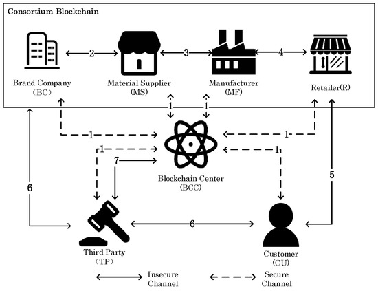 - This step is the registration phase for each role in the system. All participants in the clothing brand company (BC), material supplier (MS), manufacturer (MF), retailer (R), customer (CU), and third party (TP) need to be authenticated at the CA node in the blockchain network. After passing authentication, the roles can exchange information through the channel.