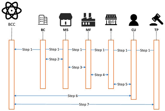 There are the seven ‘actors’ from the supply chain flow framework for a Hyperledger Fabric-based anti-counterfeit management system for traceable brand clothing. The specific process is shown in Sequence Figure 3. The specific steps are: