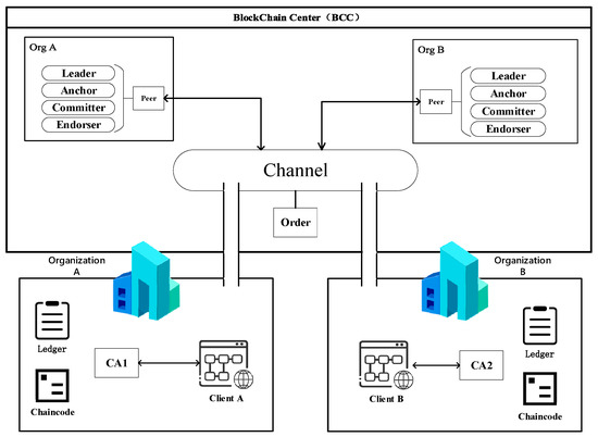 Suppose that Organization A and Organization B want to interact with each other. In that case, firstly, Organization A and Organization B register with the CA node of each organization through the client of each organization, and the CA node returns the authentication certificate, public key, and private key to verify the validity of their identities. Organization A encrypts the transaction information with the distributed public key and uploads the encrypted information to the blockchain through the order node via the peer node. Organization B receives the transaction information uploaded to the blockchain by Organization A through the channel and triggers the chain code to update the local blockchain ledger for data storage. In the overall framework, the information interaction between two different functions is mainly done through channels.