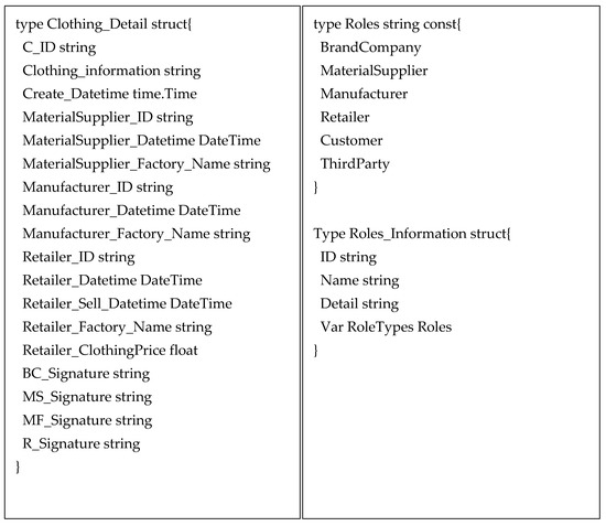 During the initialization phase, each company with different roles forms an organization. Figure 5 represents the basic chain code structure in the Hyperledger Fabric network architecture that we designed. The left side of the structure stores the information of designer apparel, and the right side shows the structure and enumeration of role types of the roles participating in the supply chain. When a designer apparel product is manufactured in the supply chain, each detail is appended to the chain code structure through the roles involved in the supply chain.