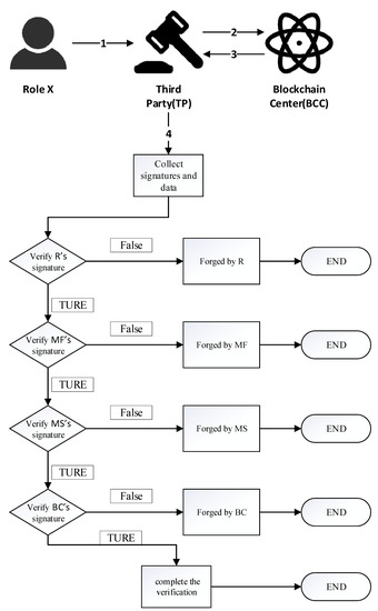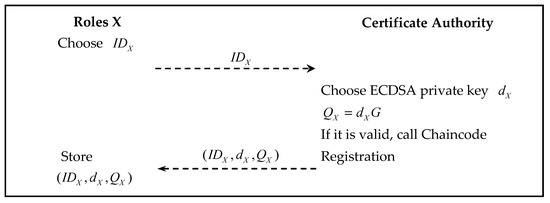 All nodes that want to join the Hyperledger Fabric blockchain network, including the BC, MS, MF, R, CU, and TH, need to register with the certificate authority (CA) node in the Blockchain Center, and will be given a corresponding public and private key. We use ‘Roles X’ to represent all arbitrary roles in the blockchain system; Figure 6 represents the flowchart of the registration phase.