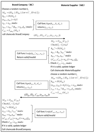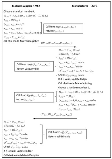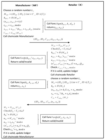 We used the Elliptic Curve Encryption Algorithm (ECDSA) to ensure the security of the entire system. We encrypted the communication in every process in the supply chain by ECDSA to ensure the system’s data integrity, non-repudiation, and privacy. By deploying and designing the chain code, we also further secured the data uploading operation and updating in the system. In particular, we used BAN logic to analyze the authentication of the identity.