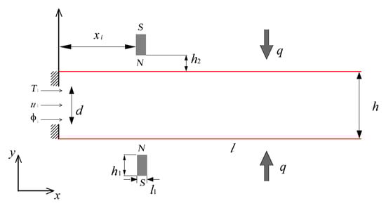 The physical model was simplified from the chip’s three-dimensional stacking system. The physical model and coordinate system are shown in Figure 1, indicating that the height and length of two-dimensional plane microchannel are h = 2 mm and l = 20 mm, respectively. Fe3O4-H2O nanofluid enters the microchannel in the form of a jet with an inlet width of d. It should be indicated that nanoparticles have uniform temperature, velocity, and volume fraction distributions at the inlet of the microchannel. The thermophysical characteristics of the Fe3O4-H2O nanofluid are shown in Table 1. Moreover, the same constant heat flux q is applied to the upper and lower walls of the microchannel while the side walls are insulated. Two identical permanent magnets are symmetrically arranged on both sides of the microchannel. The length l1 and width h1 of the permanent magnet is 0.5 mm and 1 mm, respectively, the longitudinal distance between the magnet and the wall surface h2 is 1 mm. The distance between magnets and microchannel entrance is xi.
