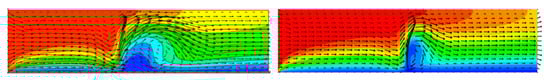 To evaluate the accuracy of the numerical model, results issued by Ranjan et al. [] were selected as the benchmark solution. In this regard, Figure 2 shows the temperature distribution and velocity vectors in the studied case. Table 3 compares the average Nusselt number of them, the maximum error between them was 3.13%. It was observed that the obtained results were in excellent agreement with those issued by Ranjan et al. [], thereby validating the established model.