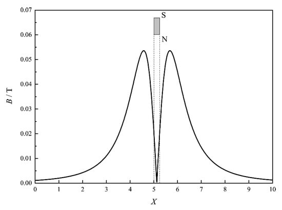 Figure 3 shows the magnetic flux density that is produced under permanent magnets along the X-axis centerline of the microchannel. It can be seen that the magnetic flux density curve presents an M-shaped distribution along the length of the microchannel. The magnetic flux density on both sides of the magnet was the largest, reaching 0.054 T, while the magnetic flux density under the magnet was the smallest, close to 0. The model equation includes the effect of Kelvin force, thermophoresis, and so on. Thus, the Fe3O4 nanoparticles in nanofluid will move along the gradient magnetic field under the action of Kelvin force generated by the gradient magnetic field, thus the Kelvin force near the two sides of the magnet was the largest. At the same time, the magnetization of Fe3O4 nanoparticles decreased significantly at high temperatures. Therefore, the effect of the gradient magnetic field on the flow and heat transfer performance of the nanofluid in the central region of the microchannel was greater than that in the region near the hot wall. In addition, the nanofluid will migrate to the lower temperature region because of thermophoresis, thus the magnetic field effect will be further enhanced in the low-temperature region. The local asymmetry of the thermal boundary layer around the magnet and the spatial heterogeneity of fluid sensitivity will lead to the flow of cold nanofluid near the magnet. The alternating decrease and increase of magnetization of magnetic particles will lead to the generation of the disturbed region near the magnet.