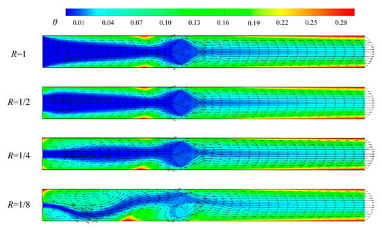 The velocity vector and temperature distribution of nanofluid in the microchannel at various inlet openings when Xi = 4 and Re = 35.4 are presented in Figure 4. When the inlet opening is large, e.g., R = 1, 1/2, 1/4, the nanofluid in the microchannel is symmetrical up and down, and the streamline and isotherm are smooth. When the inlet opening is reduced to R = 1/8, the nanofluid flow deflects upward to form an asymmetric structure. When the inlet opening is reduced to R = 1/8, the nanofluid deflects upward to form an asymmetric structure. This is because the fluid enters the sudden expansion pipe at a low Reynolds number, the pipe diameter increases suddenly, the fluid flow state changes, and fluid flow forms turbulence. There are two recirculation zones near the upper and lower walls, and the local high temperature appears at the microchannel entrance. The local high-temperature region at the microchannel entrance increases with the decrease of the inlet opening.
