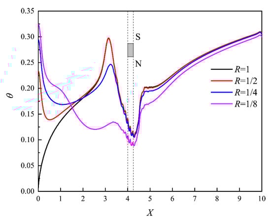Figure 5 shows the distribution of the temperature along the upper wall in the microchannel at various inlet openings when Xi = 4 and Re = 47.2. It can be seen that the wall temperature near the magnet decreased greatly, and the local high-temperature region was formed at the front end of the magnet due to the velocity stagnation. When the inlet opening decreases, the local high temperature appears in the entrance corner of the microchannel, and the local high temperature increases with the decreasing of the inlet opening. When R = 1/8, the velocity stagnation region at the front end of the magnet becomes the highest temperature region in the whole microchannel, which has an adverse effect on the overall heat transfer performance of the microchannel. Especially, the nanofluid near the magnetic pole is affected by the magnetic pole and forms a vortex, which destroys the fluid boundary layer on the wall near the magnetic pole. This results in a zigzag temperature distribution near the magnet pole.