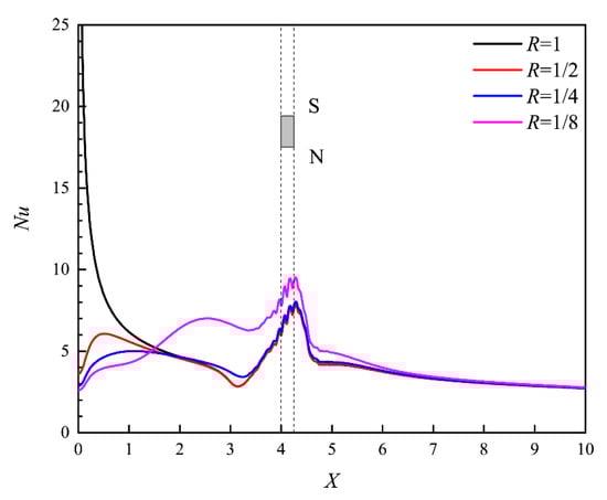 Figure 6 presents the Nuloc at the upper wall in the microchannel at various inlet openings when Xi = 4 and Re = 47.2. In general, the magnetic field enhances nanofluid flow at different openings, the turbulent region near the magnet enhances the convective heat transfer, and Nuloc at the entrance decreases with the increase of opening. When R = 1, it decreases along the flow direction of the nanofluid, and fluctuates obviously near the magnet, and then tends to be stable. This is because the magnetic particles in the nanofluid near the magnet move to the hot wall under the action of Kelvin force, which makes the local thermal conductivity increase and the local heat transfer ability increases. When R = 1/2 and R = 1/4, the Nuloc at the upper wall is close. When R = 1/8, it increases gradually along the microchannel and reaches the maximum near the magnet. This is due to the upward deflection of the nanofluid jet after it hits the lower wall of the microchannel when the inlet opening is small, resulting in a counterclockwise vortex on the upper wall of the front end of the magnet, forming a stagnation region. The existence of the magnet makes this phenomenon more obvious, which leads to the gradual enhancement of heat transfer ability at the upper wall.