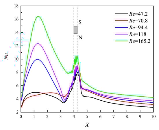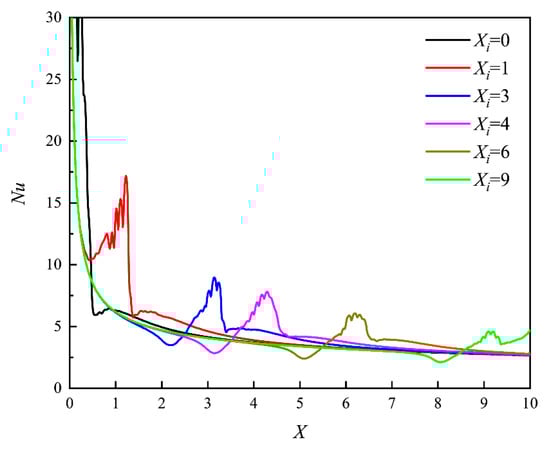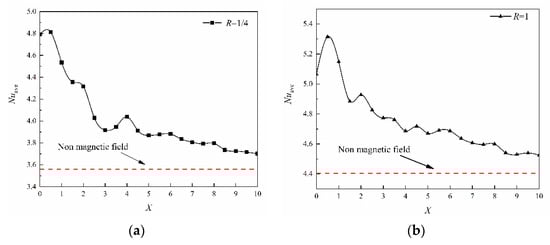 To understand the influence of magnets on the heat transfer of nanofluid as a whole, Figure 11 shows the effect of permanent magnet positions on the average Nusselt number at the upper wall for Re = 47.2. It can be seen that the magnetic field enhances the heat transfer of nanofluid, and the average Nusselt number increases. The position of the magnet has an important influence on the heat transfer of nanofluid. The average Nusselt number decreases as the magnet position moves backward along the long direction of the microchannel. When the inlet opening R was 1 and 1/4, the average Nusselt number was 5.315 and 4.182, respectively, at Xi = 0.5. Compared with the non-magnetic field, the heat transfer gain increased by 17.2% and 35.2%, respectively.