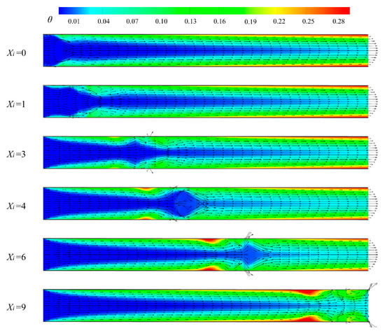Figure 8 illustrates the velocity vector and temperature field in the microchannel at various magnet positions when R = 1 and Re = 47.2. The stagnation region of the front end of the magnet increases with the increase of the position. Under the action of Kelvin force, nanofluid first extrudes to the middle channel and then impacts the wall. In addition, the magnetic field intensity directly below the magnet is small, the temperature of magnetic particles moving near the wall increases, the magnetic intensity decreases, and the Kelvin force decreases, which causes the nanofluid to rebound and continue to squeeze toward the microchannel center after impacting the wall. The stagnation region of the front end of the magnet increases with the increase of Xi. When the magnet nears the microchannel entrance, the interruption of the thermal boundary layer caused by the magnetic source occurs earlier because the thermal boundary is not fully developed.