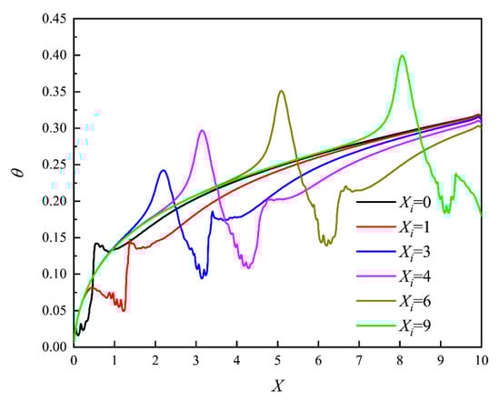 Figure 9 and Figure 10 show the influence of magnet position on the temperature and Nusselt number at the upper wall are illustrated for R = 1 and Re = 47.2, respectively. In general, the temperature of the upper wall increases along the length of the microchannel at different positions of the magnet, and local high and low temperatures will occur near the magnet. The Nuloc decreases with the increase of microchannel length at different magnet positions, and the Nuloc in the entrance section is the largest. This is because the thermal boundary layer in the entrance section has not been fully developed, and there is no space for the front end of the magnet to form a stagnant region. As the parameter Xi increases, the corresponding heat transfer enhancement of the magnet to FHD decreases gradually, and the effect is the smallest at the exit, that is, when Xi = 9.