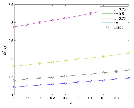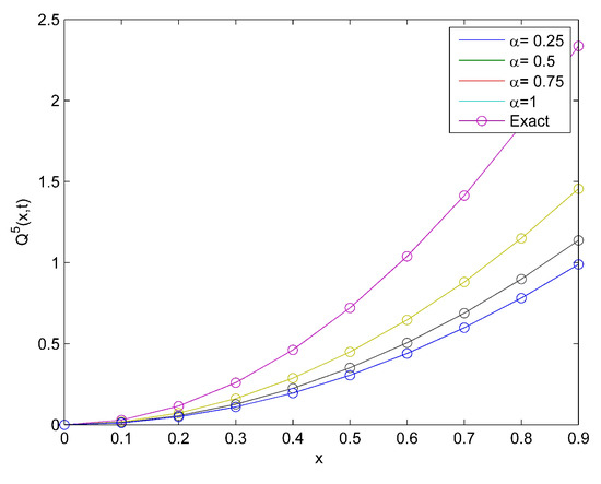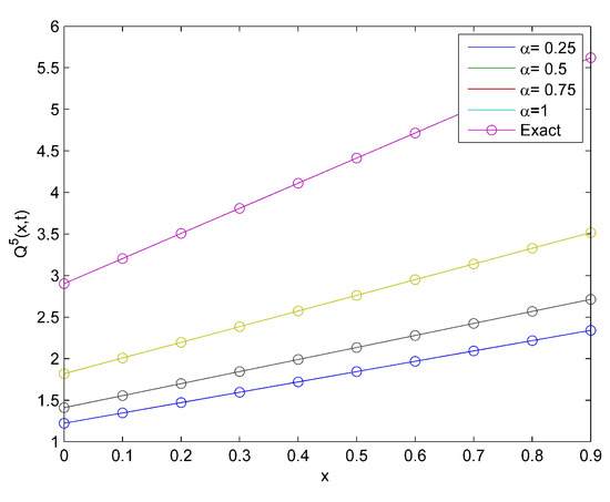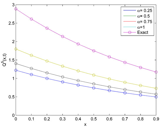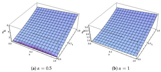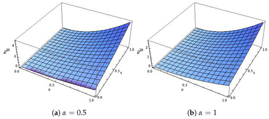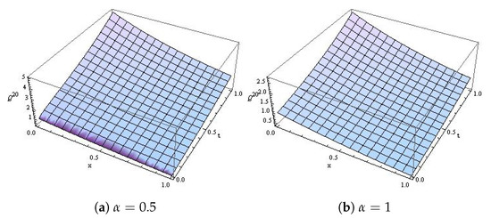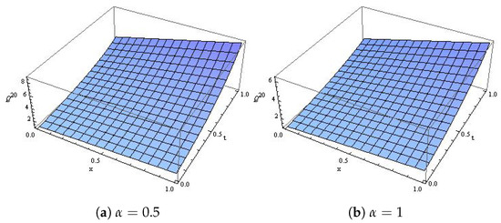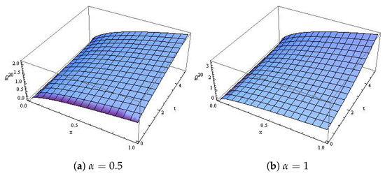 which is the exact solution obtained in [2]. Figure 5 reveals the effect of α and the natural behavior of the model at distinct values of α. Moreover, Figure 6a,b is the surface plot at and 1, respectively.