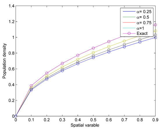 which is the exact solution obtained in [4]. Figure 9 reveals the effect of α and the natural behavior of the model at distinct values of α. Moreover, Figure 10a,b is the surface plot at and 1, respectively.
