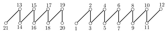 This concludes the proof since, in all three cases, all the vertex-weights are distinct. An example of a distance antimagic labeling for is depicted in Figure 2. □