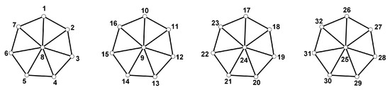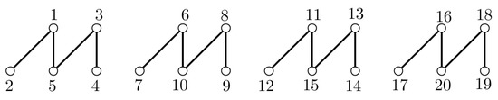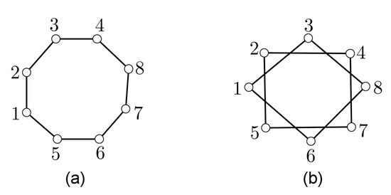 For any connected graph G, we denote by , the distance-k graph of G, as the graph whose vertices are those of G and whose edges are the 2-subsets of vertices at mutual distance k in G [22]. In particular, . On the other hand, the k-th power graph of a graph G, , is another graph that has the same set of vertices, but in which two vertices are adjacent when their distance in G is at most k [23]. Clearly, .