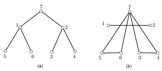 However, since it is relatively easier to find a distance (anti)magic labeling for a graph, the converse of Theorem 9 is more interesting for us. Let be the set of graphs of order n. Define a function , where . It is clear that is neither injective nor surjective. For instance, as depicted in Figure 9, is , however there is also another graph, in this case , where . Notice that both and are -antimagic with the same vertex labeling.