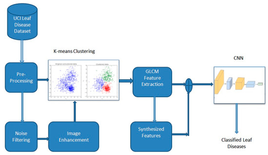 This work presents a novel hybrid learning model for identifying and categorizing various leaf diseases, as shown in Figure 2. This architecture segregates the affected portion of the leaf by finding the Region Of Interest (ROI) using the k-means clustering algorithm. The texture is a critical feature commonly employed in image classification to help discriminate various classes with analogous spatial characteristics. The textural information offers additional details for classification, which enhances the accuracy [9]. To cater to this requirement, researchers have developed GLCM [10] for textural feature extraction. Intra- and inter-level redundancy among the features is a common concern in image classification. GLCM with different window sizes derives numerous recurrent features. These recurrent features degrade classification accuracy; it necessitates feature selection techniques to choose the most pertinent features for generating efficient learning models [11,12,13]. The conventional and widely employed Principal Component Analysis (PCA) along with Whale Optimization Algorithm (WOA) was proposed by Gadekallu et al. [14] to inspect redundancies in the GLCM feature set and scrutinize only the pertinent features [15,16,17]. Finally, Extreme Learning Machine (ELM), multi-class SVM, and CNN with an Adam optimizer were applied to classify various leaf diseases.