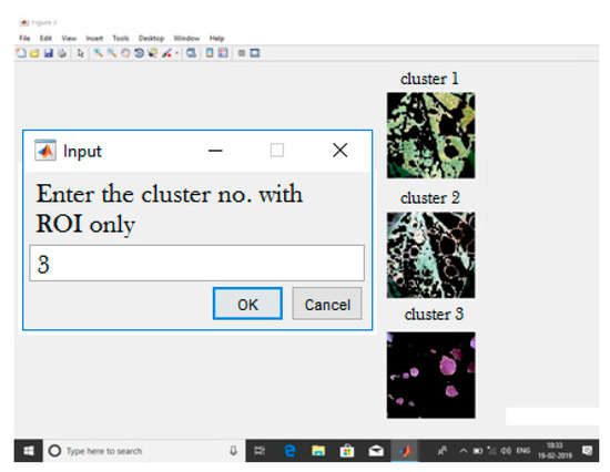 A pre-processed image was fed into the k-means clustering algorithm, categorizing the leaf into two parts—viz., infected portion and non-infected portion. The k-means clustering method categorizes an image based on the number of feature classes. First, pixels are segmented and then categorized into corresponding feature classes by computing the Euclidean distance values. Based on the calculated feature classes, the image is segmented into various groups containing k types of ROI. When k is 2, it segregates the affected region in one cluster and the unaffected area in another cluster. If k > 2, it can identify the type of disease, and each cluster corresponds to one kind of disease. This segmentation helps to identify the diseased area in a leaf, as shown in Figure 3, and helps to analyze the disease type and severity. Figure 3 shows the formed clusters when k is set to 3.