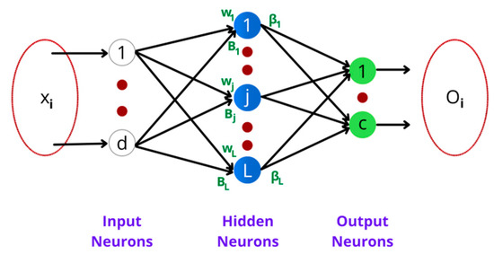 ELM is basically a feed forward network where hidden neurons are placed in a hidden central layer, as shown in Figure 4. There are d input vectors that can be classified under c output classes using L hidden neurons. The neurons present in the hidden layer are represented as h(x) = [h1(x), …, hL(x)]. Each hidden neuron performs a nonlinear mapping of features emerging from input neurons to the output neurons using the weight and bias as given in the Equation (1).