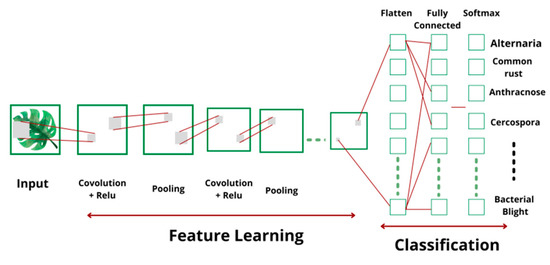 The architecture of CNN [18] used to categorize the disease and predict the severity is shown in the Figure 5. CNN is the most efficient and accurate classifier, with several advantages over other classifiers in terms of memory and training time. In CNN, the convolution layer is the vital part that encompasses a set of filters. These filters work independently and obtain the feature maps using convolution operation. The convolution operation is performed by applying a non-linear function on linear filter and input maps by including a bias and receiving an output feature map. Finally, it is expressed mathematically, as given in Equation (4):