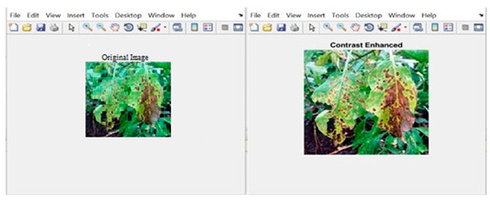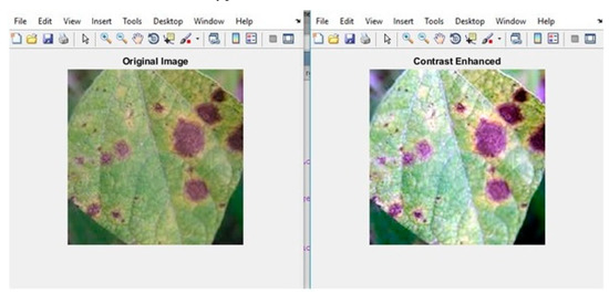 Initially, the RGB color value of the image provided in the diseased leaf dataset wasconsidered as input. The input image was improved in terms of contrast and size, as shown in Figure 6 and Figure 7. Finally, the k-means clustering algorithm was used to segment the image into three segments—viz., disease-affected ROI, unaffected ROI, and background ROI. Figure 8 and Figure 9 depict how the disease-affected areas were segmented for various disease types.