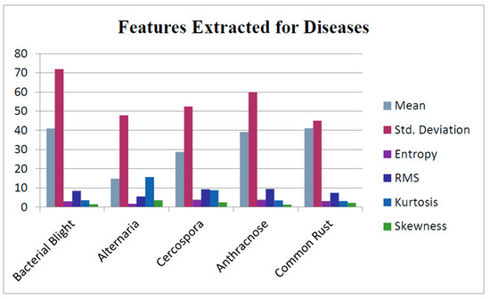 Out of the three segments, only the disease-affected ROI was analyzed to categorize the nature of the disease and assess the severity and extent of the diseased part. To accomplish this, features of the disease-affected ROI were fetched by constructing the GLCMs. In this matrix, disease symptoms were maintained by computing the values of the features—namely energy, entropy, mean, variance, standard deviation, skewness contrast, smoothness, correlation, kurtosis, homogeneity, root-mean-square (RMS) error and inverse differential moment (IDM), as shown in Figure 10. The sample GLCM values computed from the segmented image are presented in Table 1. Based on the calculated feature values, these features were matched against the values present in the training dataset. The extracted features were concatenated with the segmented leaf image into a single image matrix which was then fed into CNN to categorize the class of disease by comparing it with the existing disease classes. The model parameters used to train the CNN are depicted in Table 2.